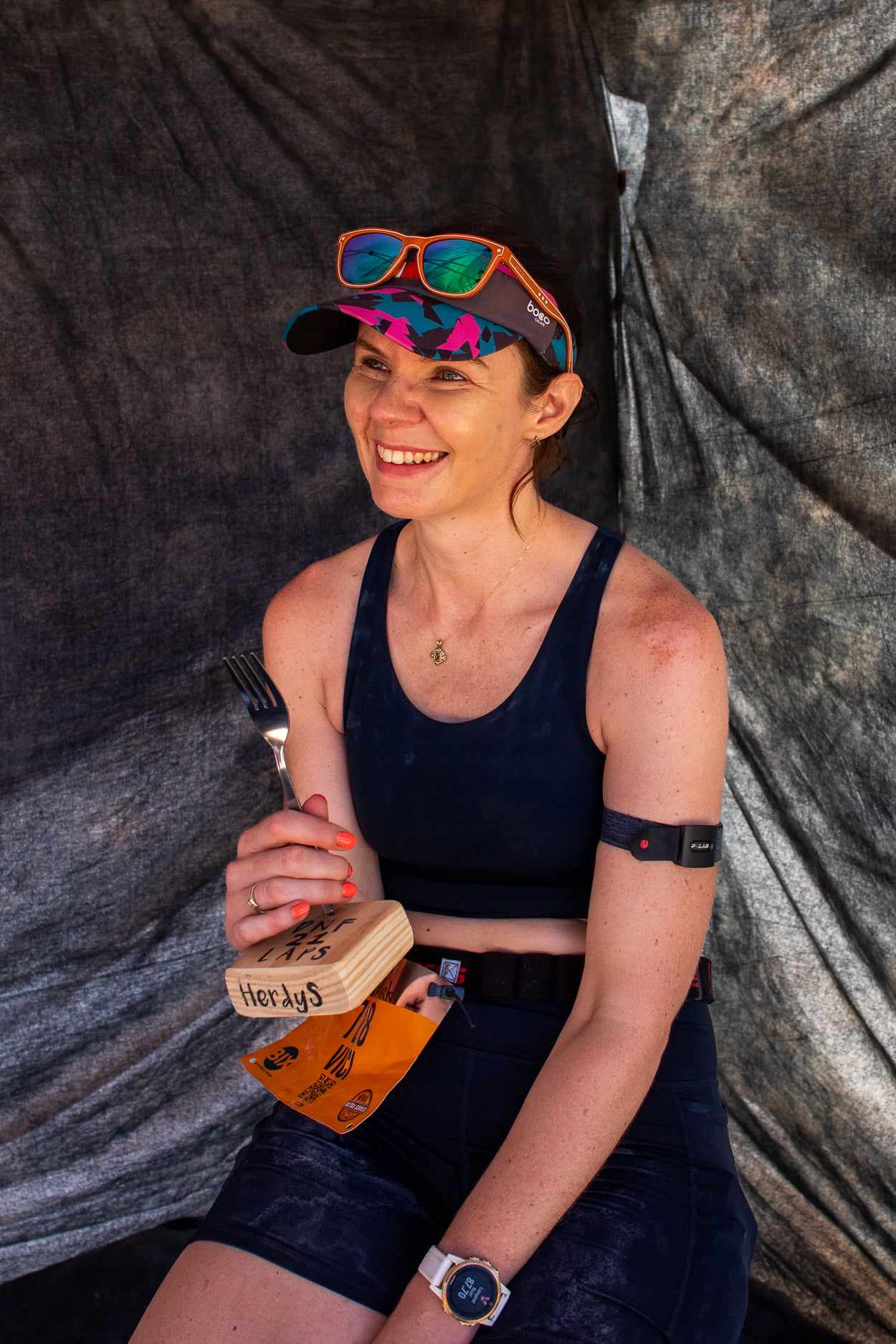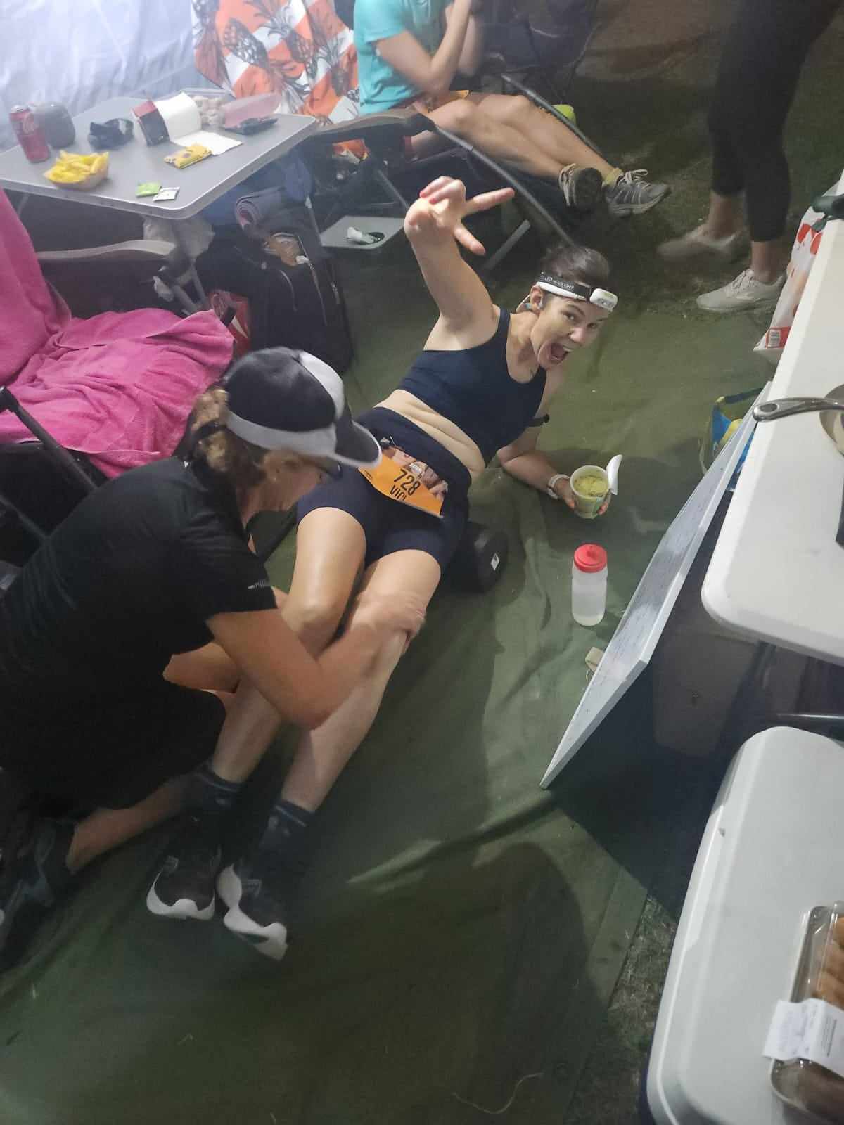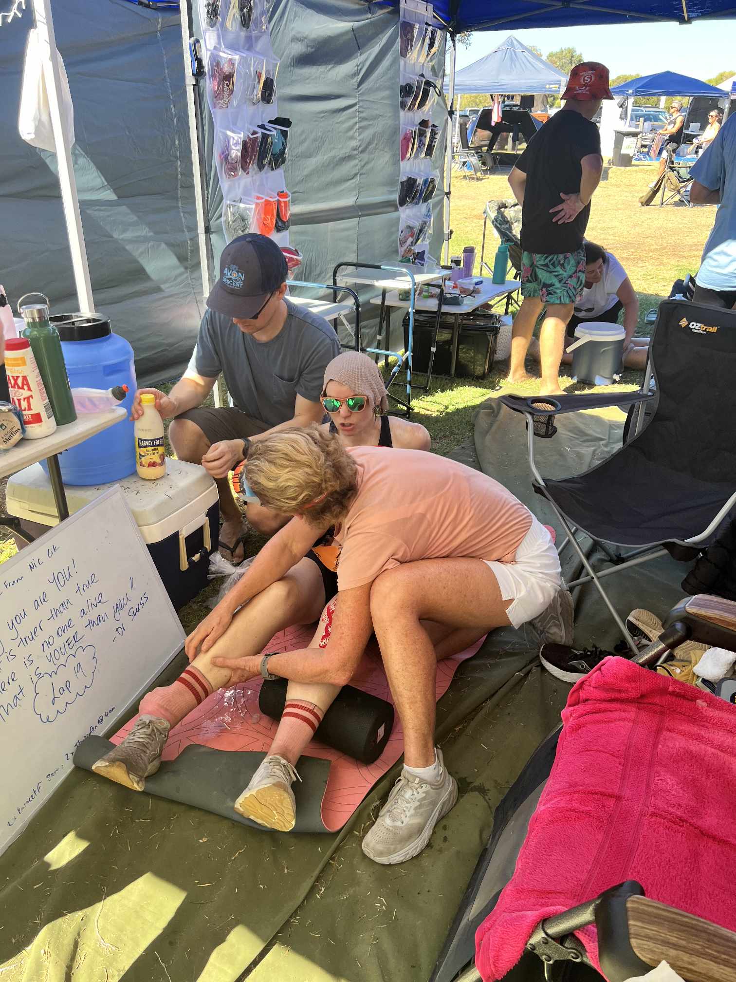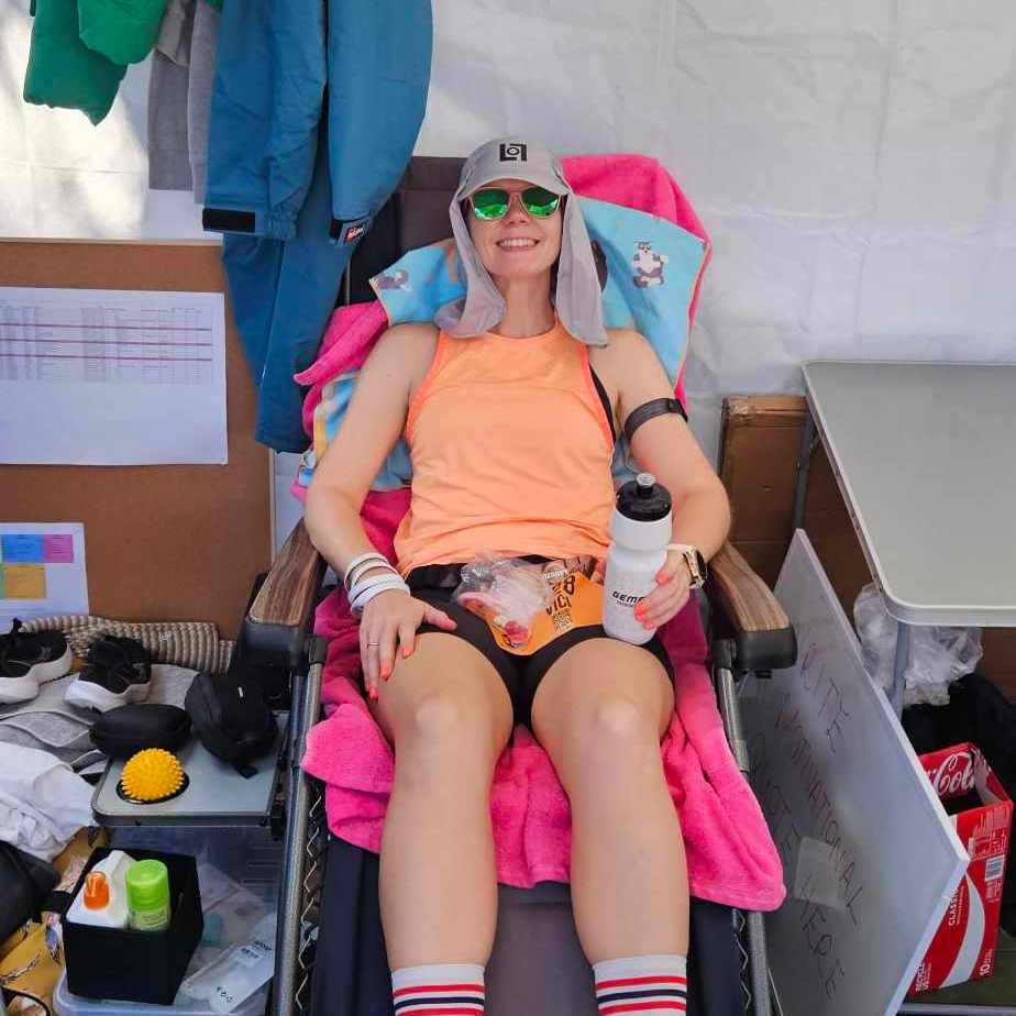 My ankle was behaving well with its ice protection, however my left knee, which had given me some problems early in my training, started to niggle. I was foam rolling every lap, which soon turned into getting a physio to strap it for me every other lap. The heat made the tape peel off within the first 3km. I only changed my shorts once on lap three and was wearing the same crop top since the start. With the toilet trips, rolling, strapping and icing, I didn’t have much time for wardrobe changes. So I looked a state but committed to being smelly and disgusting for the remainder of the race.