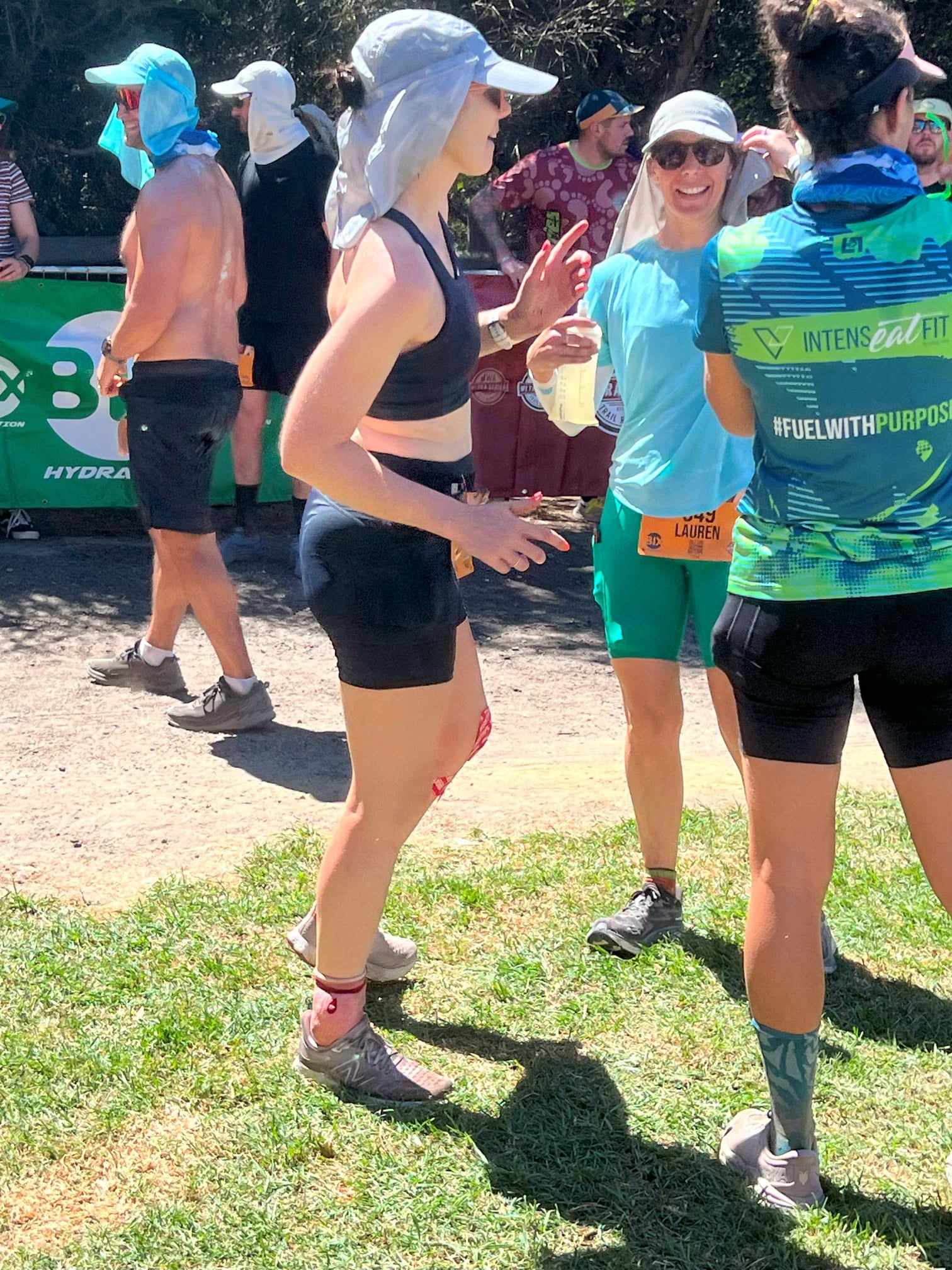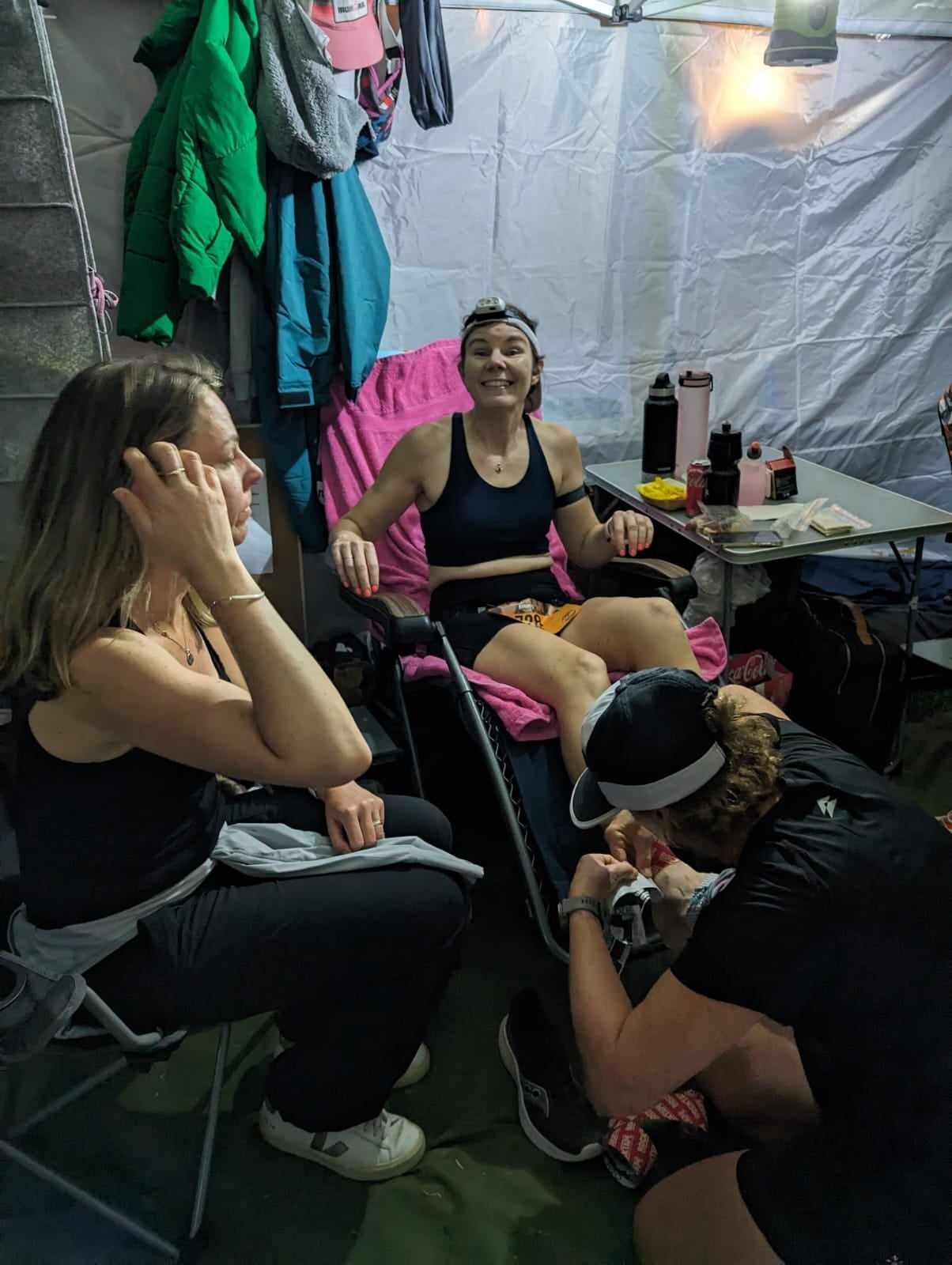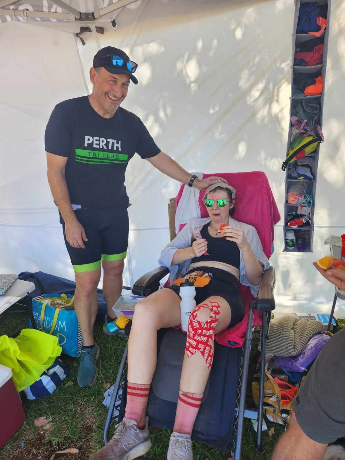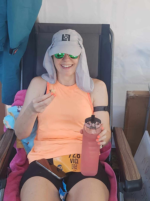 My ankle was behaving well with its ice protection, however my left knee, which had given me some problems early in my training, started to niggle. I was foam rolling every lap, which soon turned into getting a physio to strap it for me every other lap. The heat made the tape peel off within the first 3km. I only changed my shorts once on lap three and was wearing the same crop top since the start. With the toilet trips, rolling, strapping and icing, I didn’t have much time for wardrobe changes. So I looked a state but committed to being smelly and disgusting for the remainder of the race.