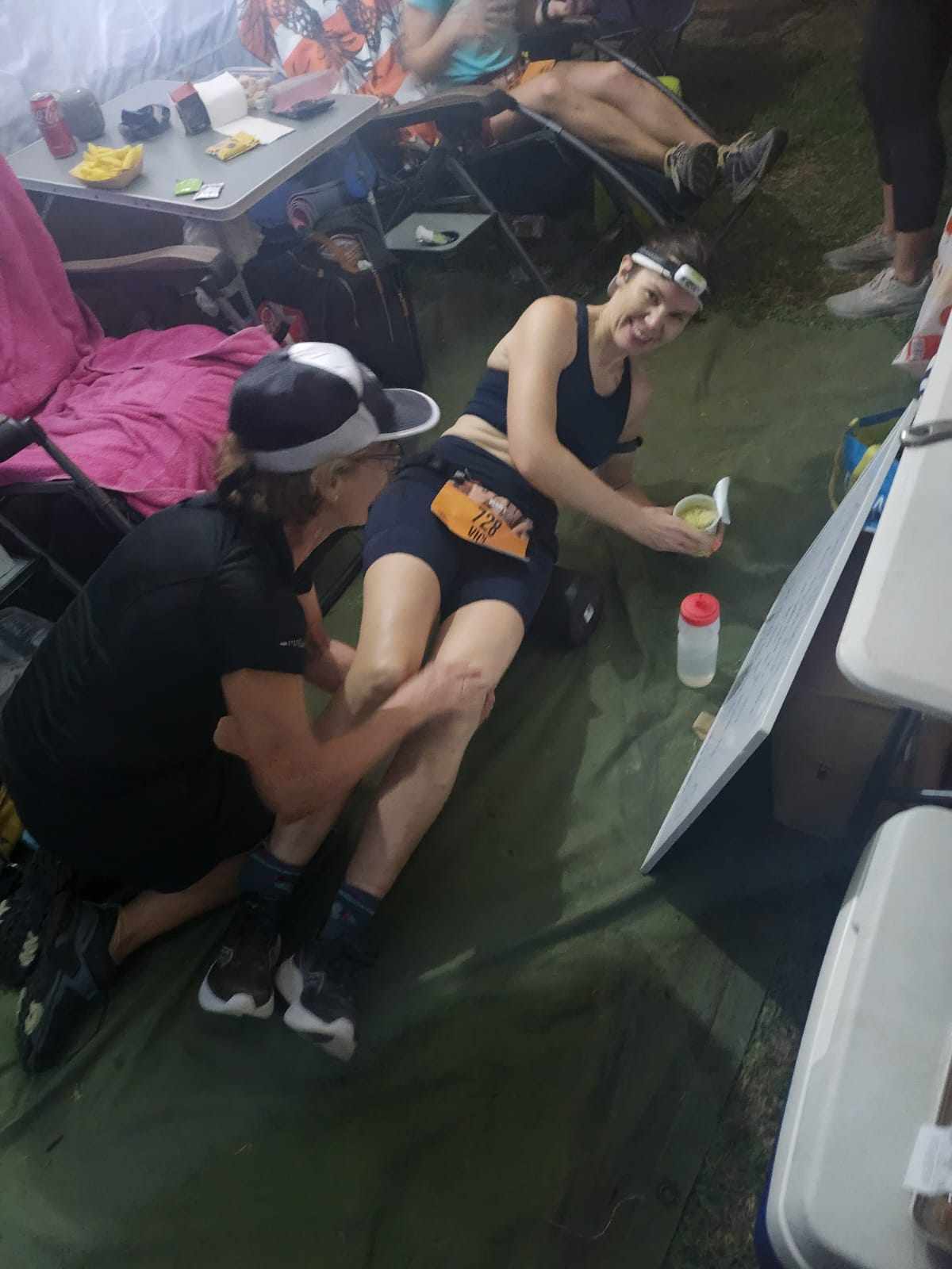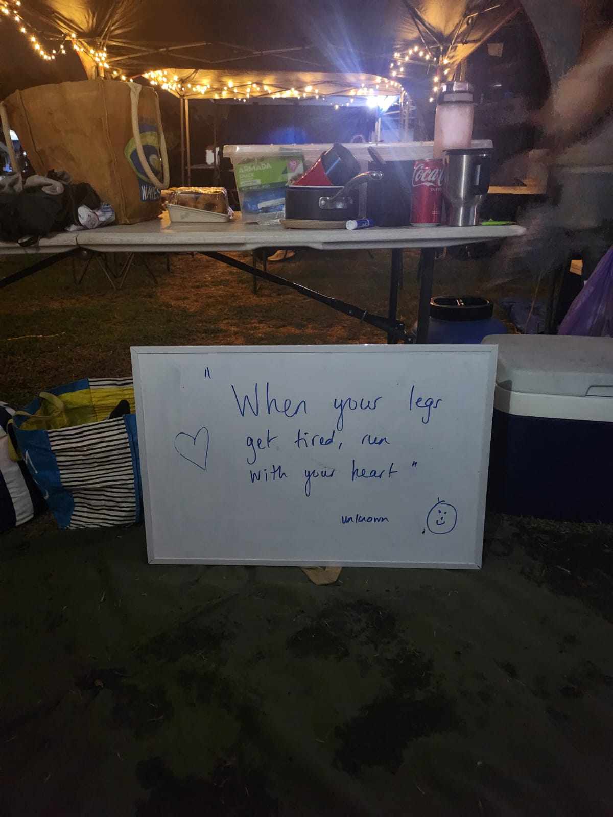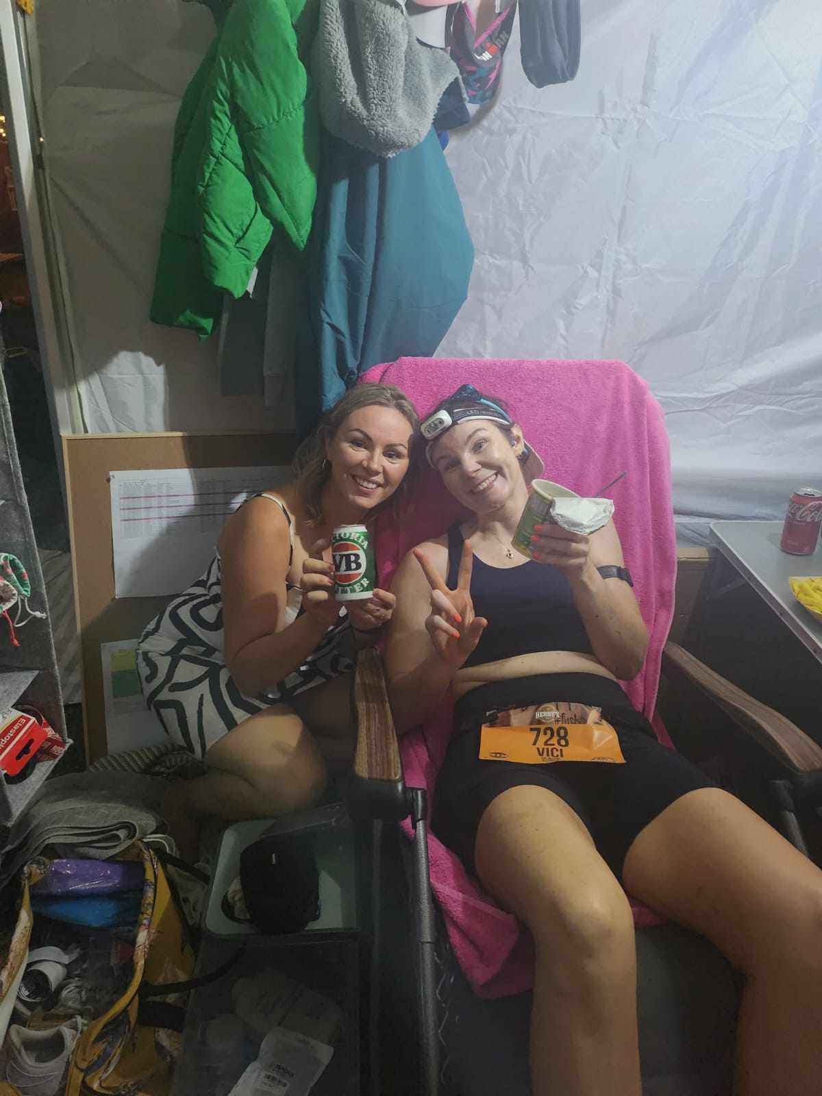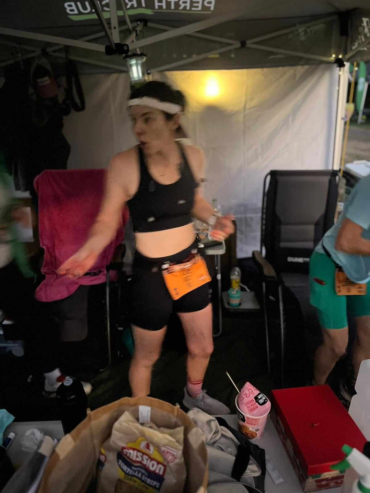 The humidity was getting to me though. My mouth was dry and I was constantly thirsty no matter how much I drunk. On reflection I was likely overdosing on Bix electrolytes which was affecting my appetite. I was also managing an upset stomach and had a couple of near misses as I rushed to the toilet before the start line at the beginning of some of the early morning laps (thank goodness for ‘my personal toilet tent’ that my partner had erected on my direction). I wasn’t able to eat any dry food – which it suddenly seemed my entire plan was made up of. My crew kept asking me what I wanted instead. I was managing electrolytes and a few lollies OK, and we found a couple of pot noodles so I ate those across a few lap breaks.